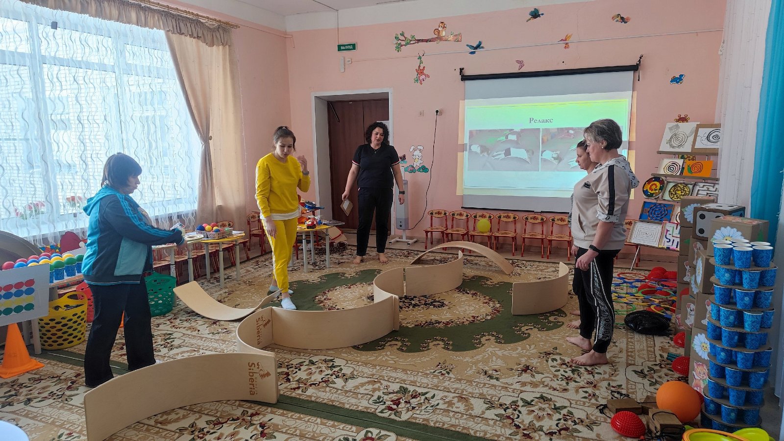 Продолжилось мероприятие мастер-классом от Анчуркиной М.Н. для педагогов. Где каждый смог попробовать новое физкультурное оборудование - сибборд.