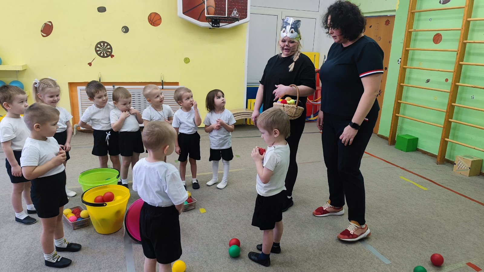 Ребята младшего возраста из группы "Цветик-Семицветик" продемонстрировали гостям своими навыки и возможности с использованием нестандартного оборудывания- клубочков ниток.