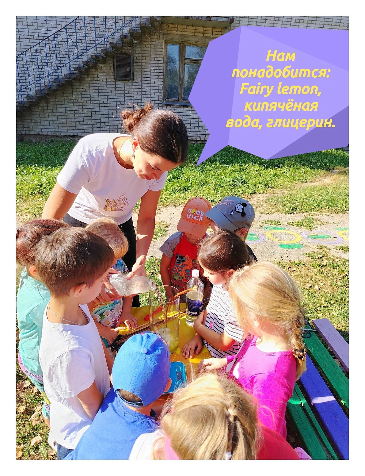 В этот день в нашем детском саду Закусило Надежда Владимировна рассказала детям о мыльных пузырях, как они образуются, что происходит, когда они лопаются.