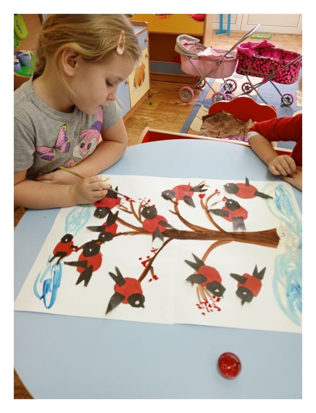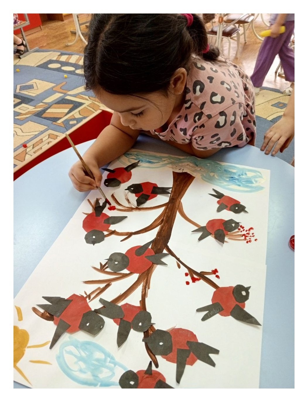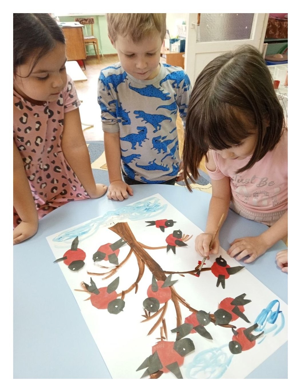 Важным моментом коллективной работы стало объединение всех индивидуальных произведений в общую инсталляцию, где каждый снегирёк теперь сидел на своей ветке, создавая одну общую картину зимнего пейзажа. Такой подход способствовал сплочению группы, укрепил навыки сотрудничества и доверия между детьми