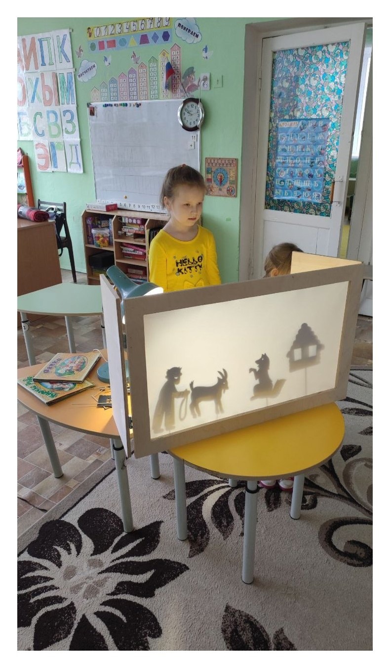 Наш воспитатель Галина Геннадьевна Хахина познакомила детей с технологией теневого театра. Она рассказала малышам об истории его возникновения, показала, как создаются тени, и вместе с детьми подготовила первую постановку.