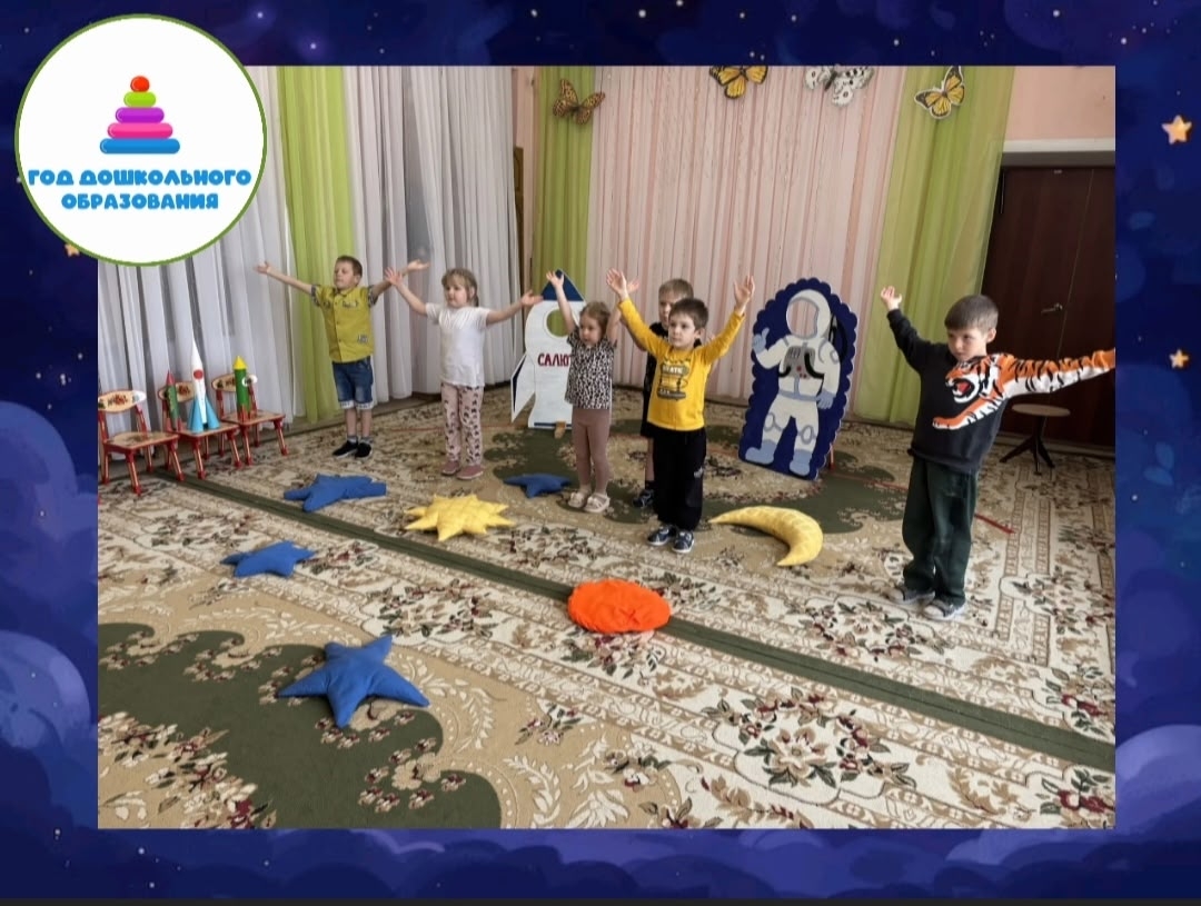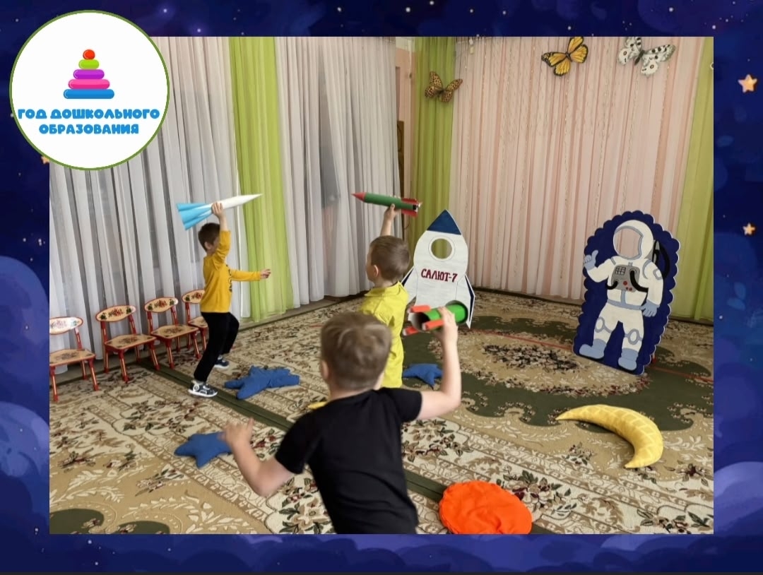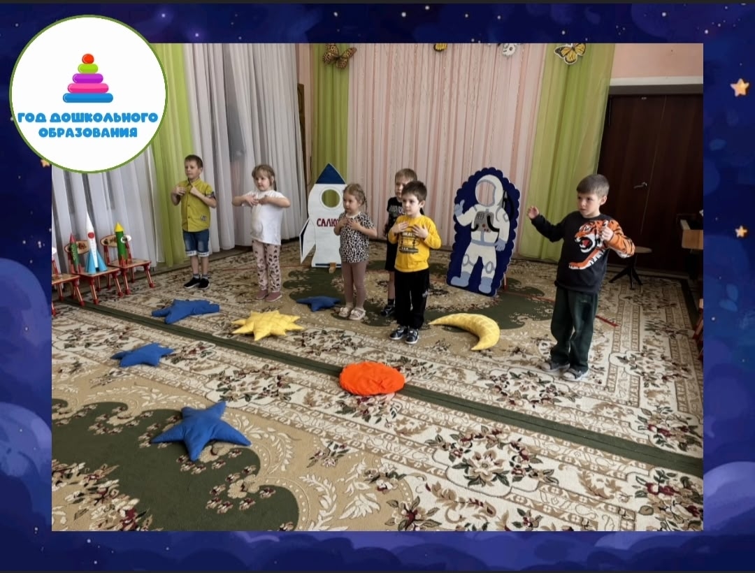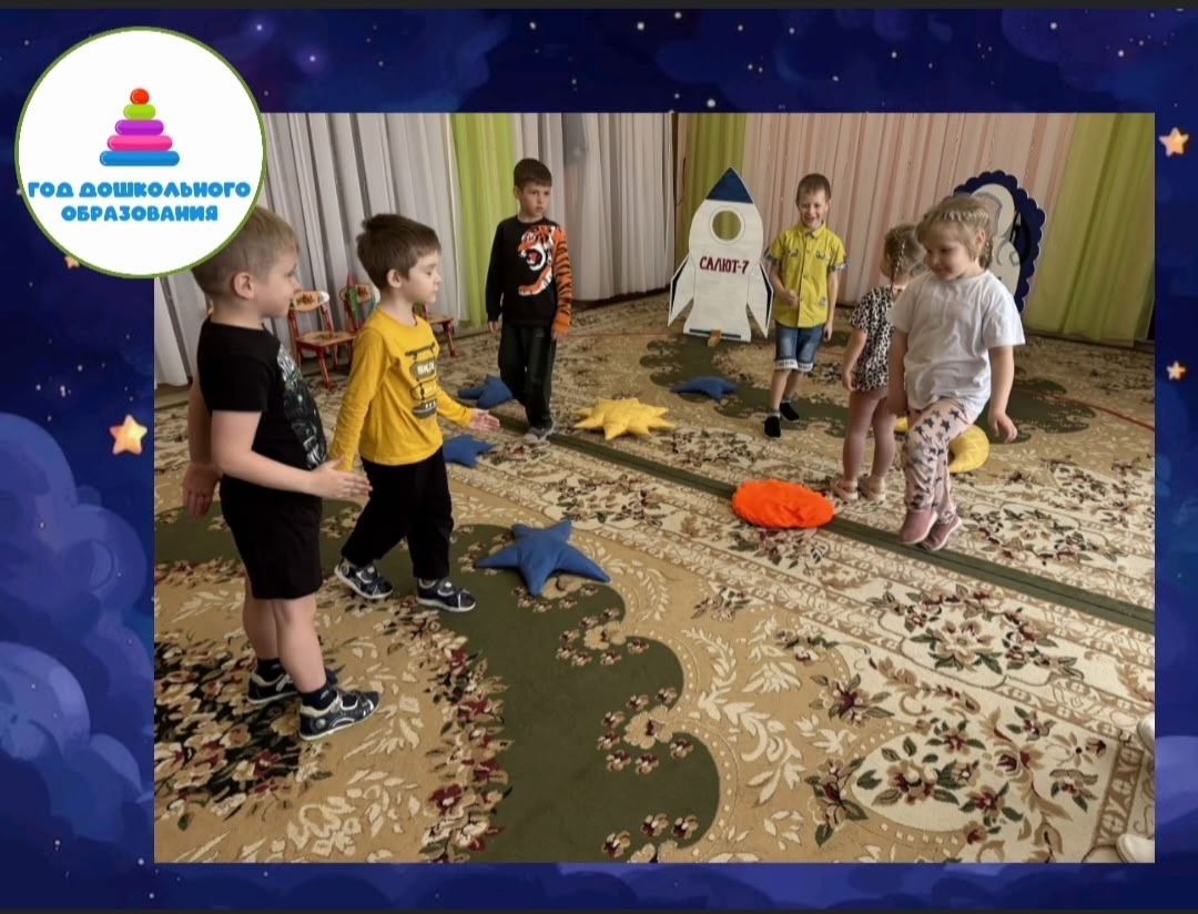 Подвижные игры – дети «летали» на ракетах, собирали космический мусор, перепрыгивали через кратеры на Луне и соревновались, кто быстрее долетит до планеты.